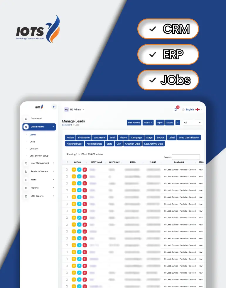 We designed a web based, completely customized Lead Management CRM that facilitates IOTS to manage incoming leads with minimal effort Key features: